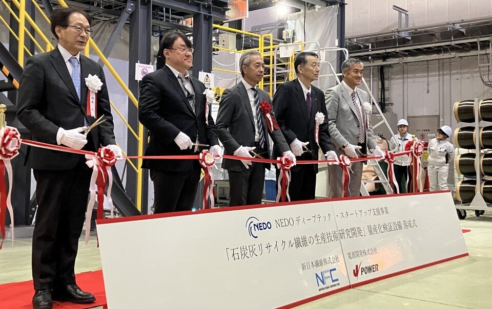 電源開発株式会社(以下「Jパワー」、本社:東京都中央区、代表取締役社長 社長執行役員:菅野 等)は、出資先である新日本繊維株式会社(以下「新日本繊維」、本社:千葉県我孫子市、代表取締役:深澤 裕)が国立研究開発法人新エネルギー・産業技術総合開発機構(以下「NEDO」、本部:神奈川県川崎市、理事長:斎藤 保)の「ディープテック・スタートアップ支援事業」による助成をもとにJパワー茅ケ崎研究所(神奈川県茅ケ崎市)に建設した環境配慮型高機能リサイクル繊維「BASHFIBER®(バッシュファイバー)」の量産化検証設備の竣工を受けて、落成式を実施しました。