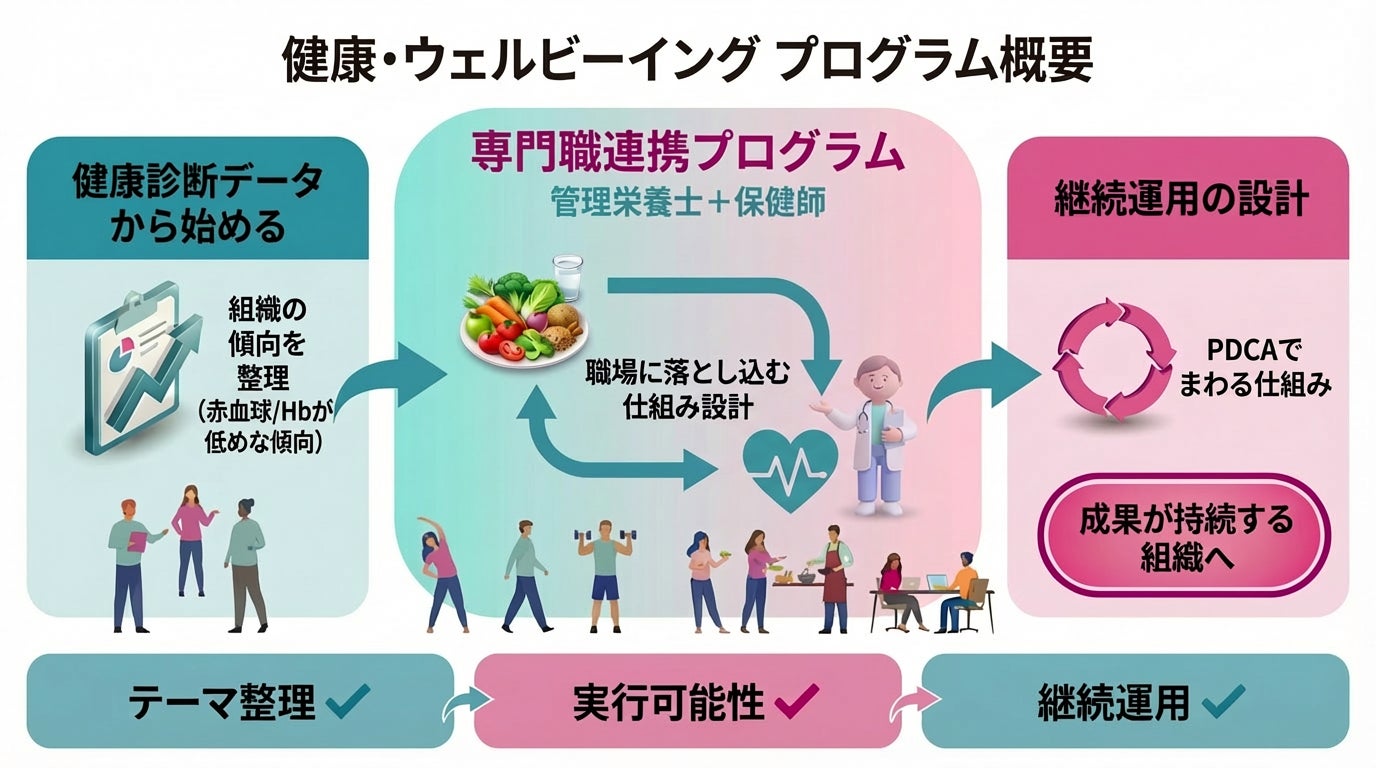 本テーマ(赤血球/Hbが低めな傾向が見られる組織向け)では、健康診断データを起点に、次の2点を軸として取り組みを設計します。