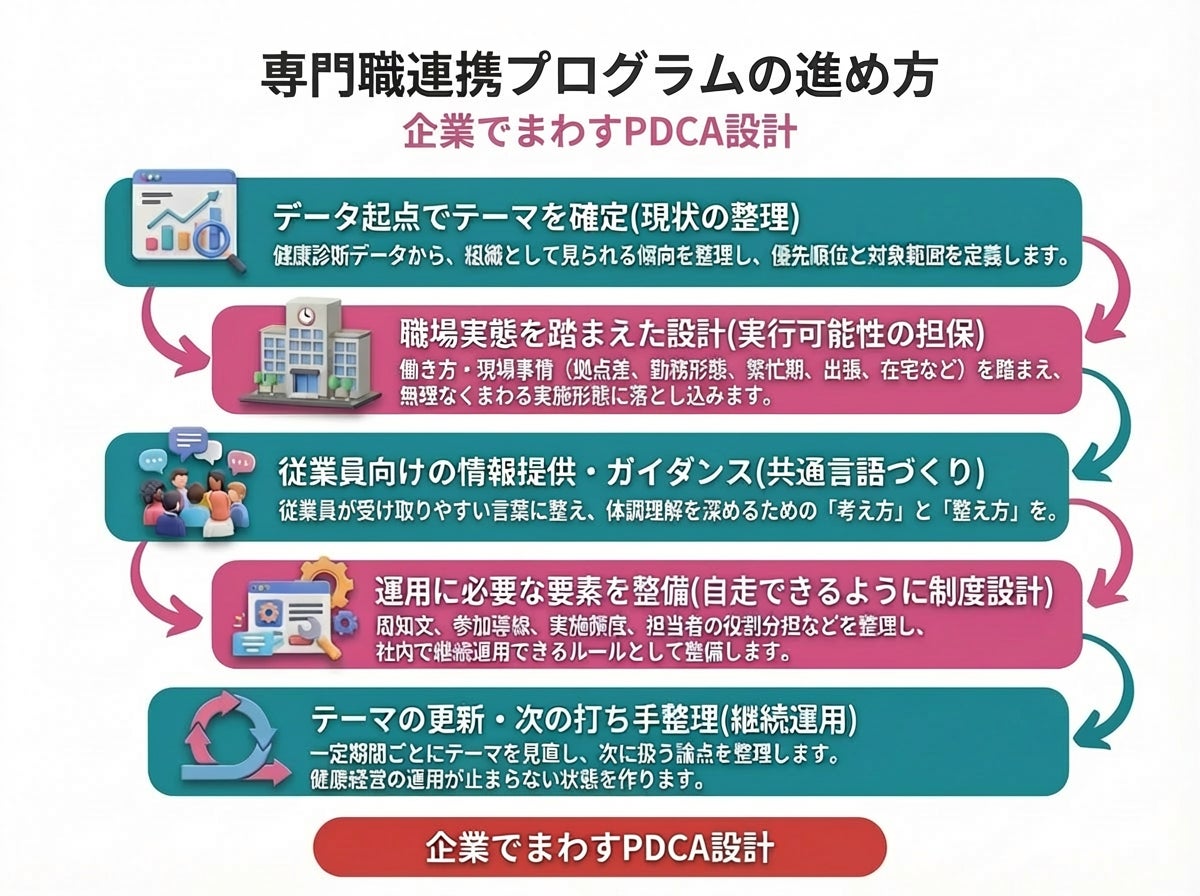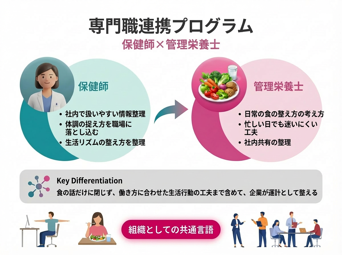・専門職連携プログラム:健康診断データを起点に、専門職が役割分担しながら、企業が実施しやすい施策設計と運用方法を整理する仕組みです。