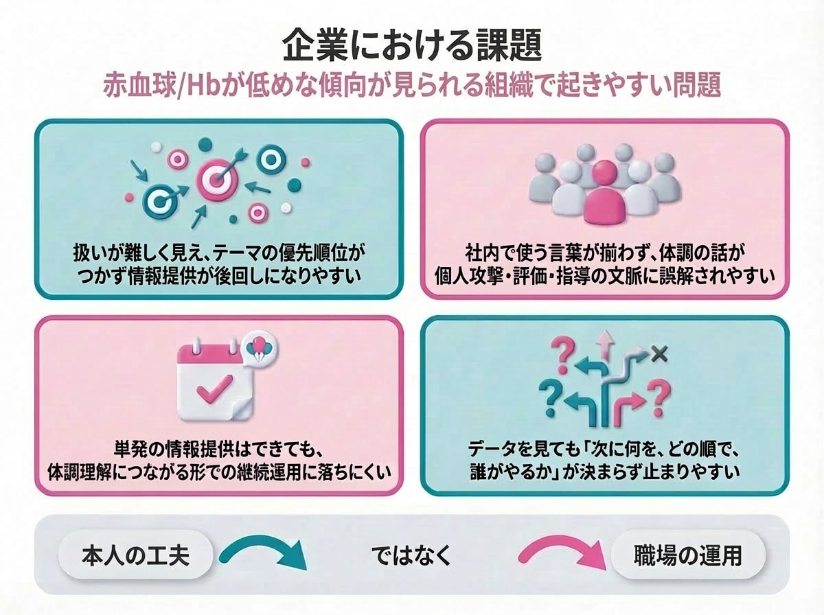 赤血球/Hbが低めな傾向は、本人の体質や生活背景の影響を受けやすく、体調の感じ方にも個人差が出やすいテーマです。一方で、社内で取り上げる際に、言葉の選び方を誤ると、本人への指摘や評価の文脈に誤解されやすく、情報提供が慎重になりすぎて止まりやすくなります。だからこそ、医療的な判断や個別の指導に寄せるのではなく、企業として「体調理解を深めるための学び」として整理し、無理なくまわす形に整えることが重要になります。