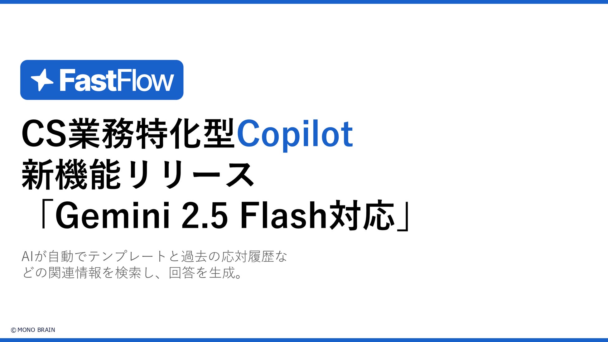 株式会社MONO BRAIN(本社:東京都渋谷区、代表取締役:加藤真規)は、CS業務特化型AI Copilot「FastFlow」が、Googleによって発表された最新の大規模言語モデル(LLM)「Gemini 2.5 Flash」に対応したことをお知らせします。