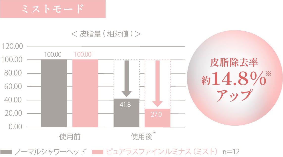 <2>皮脂除去率UP/シャワーモード:約14.2%UP(※3) ミストモード:約14.8%UP(※3)