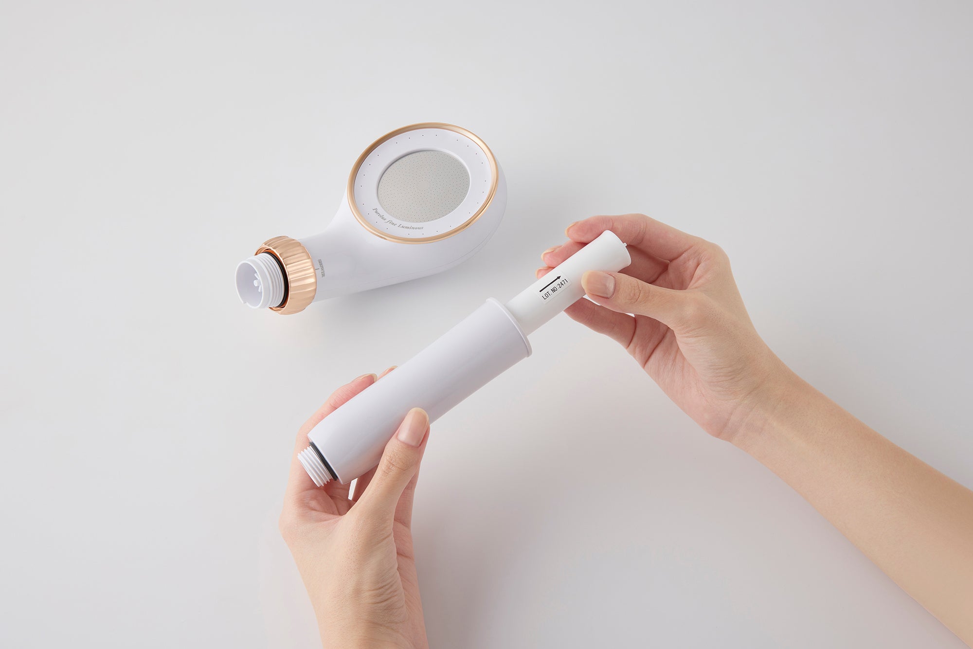 当製品は2024年9月に発売した「ピュアラスファイン」のハイエンドモデルです。「シャワーモード」と「ミストモード」、2つの水流を手元のダイヤルで簡単に切り替えられます。コロンとしたフォルムとホワイト×ピンクゴールドの配色でバスルームが華やぐデザインを目指しました。また、別売の浄水カートリッジ(※2)を使用することで水道水の残留塩素を低減させることも可能です。