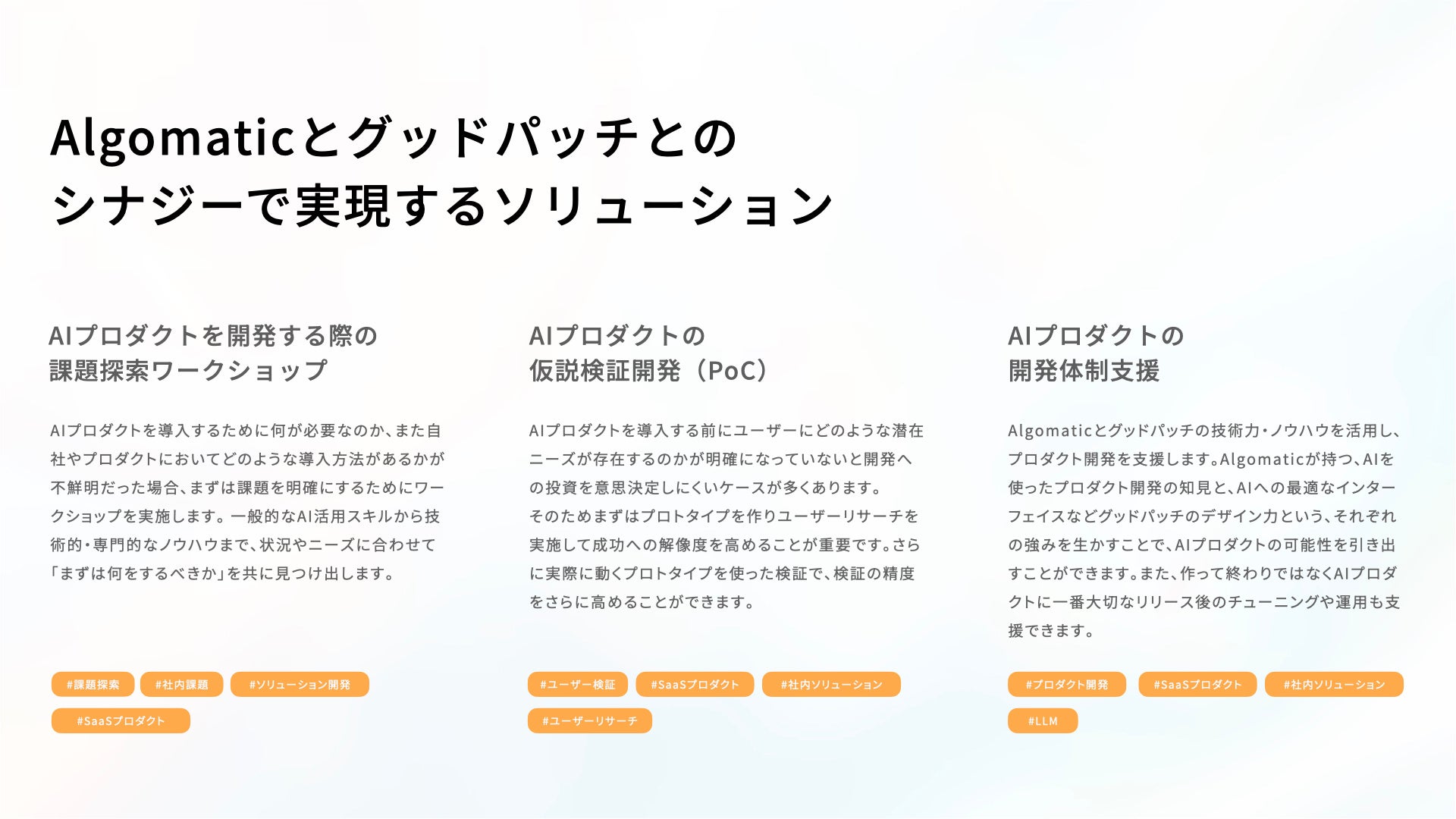 ・生成AIに特化し、事業開発を行ってきたAlgomaticの技術力と、さまざまな企業のデザインパートナーとしてUI/UXデザインやワークショップを行ってきたグッドパッチの知見を生かし、AIプロダクトの開発を行う企業を伴走支援する
