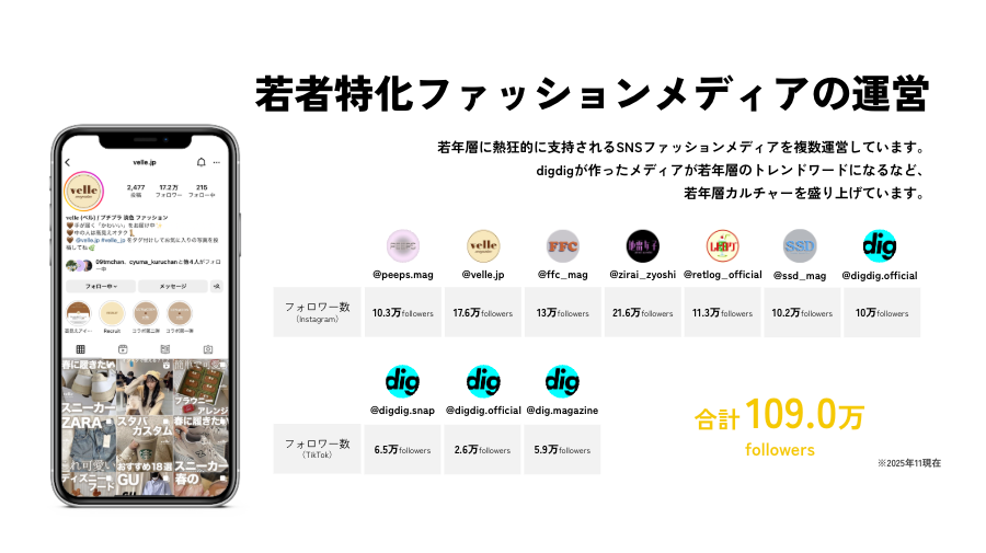 digdigは、Z世代・α世代に熱狂的に支持されるファッション特化SNSメディアを複数展開し、総フォロワー数は100万人を突破しています。