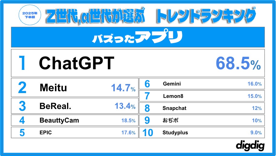 さらに、アプリ部門では ChatGPT が1位となり、他にも複数のAIサービスがランクインしたことから、日常的な学習や情報収集の場面でAIツールを使いこなす姿も見えてきました。エンタメやカルチャーだけでなく、「調べる」「考える」といった行動にもAIを取り入れることが、Z・α世代にとって自然なスタイルになりつつあると言えます。