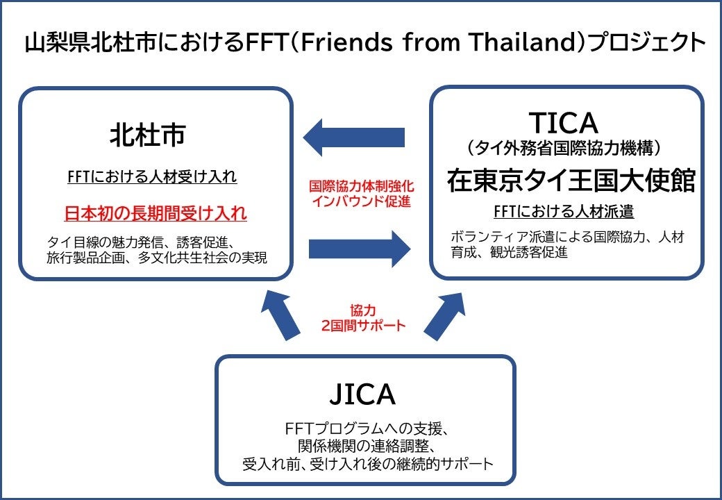 本年度より、北杜市では、外国人観光客誘客に向け積極的な誘客施策を展開しているところです。 こうした中、フレンズフロムタイランドの取り組みに参加できますことは、タイ人観光客の誘客に大きな可能性を見出すものと考えております。タイ人の目線で、観光課で共に働き、暮らす中で、北杜市の魅力を感じてもらい、SNS等での情報発信や、実際のインバウンド施策の展開などを実施していただくことは、タイ国内における知名度向上と誘客につながることと期待しています。 また任期中に多くの市民との交流を図り、お互いの文化を知り、理解することで、新しい価値を生み出すことができるはずです。