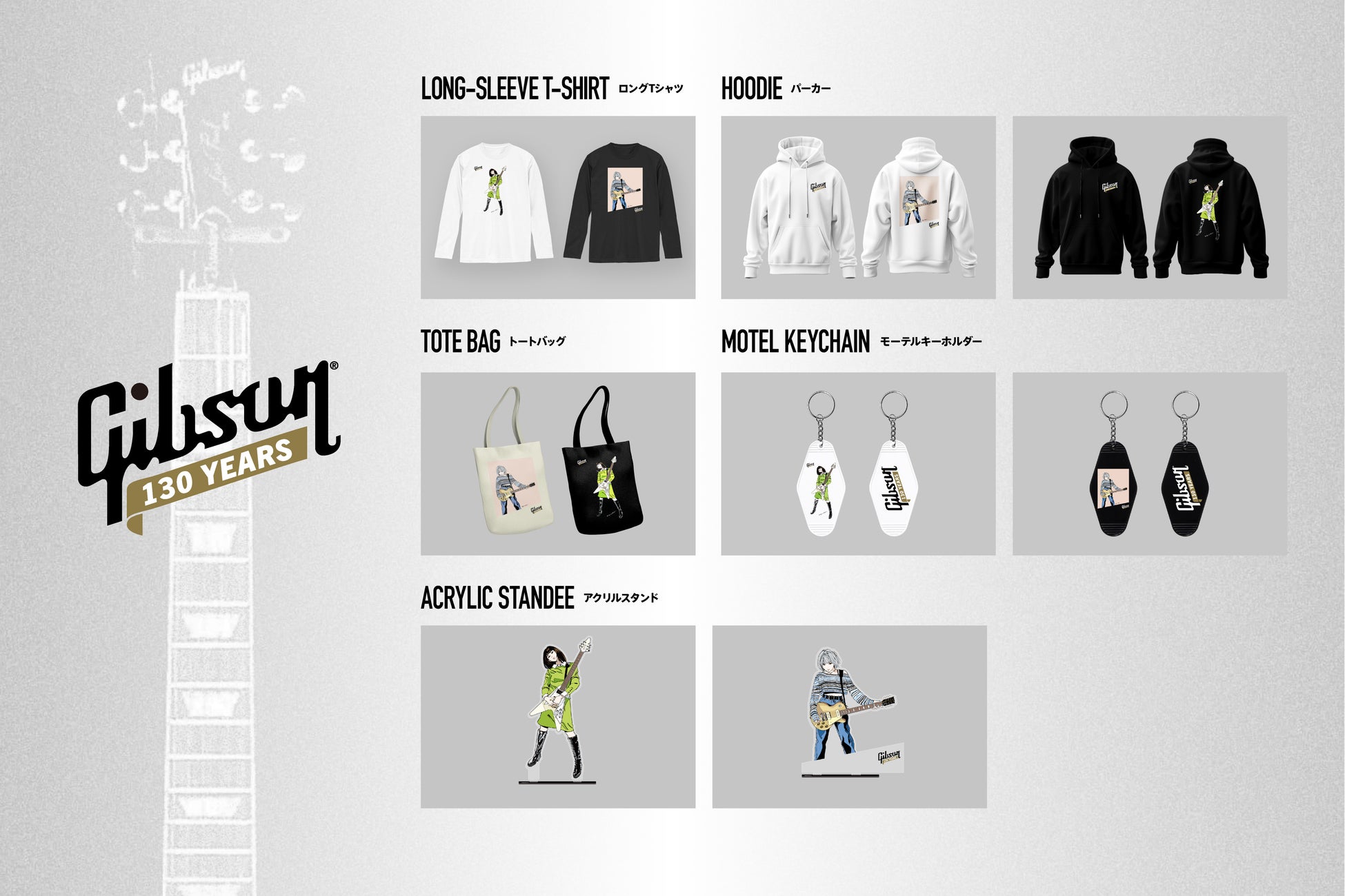 前回の受注販売で大好評をいただき、多くの再販リクエストを頂戴いたしました。その声にお応えしつつ、既に購入いただいた皆様にも改めて選択いただけるよう、カラーリングを変更したアイテムを展開いたします。そして新たなラインナップとして、アクリルスタンドとモーテル・キーホルダーの販売も決定。さらに、10月30日に開催されたギブソン130周年ライブ会場で限定販売されたオリジナル・ロングTシャツも、今回のオンライン販売の対象となります。