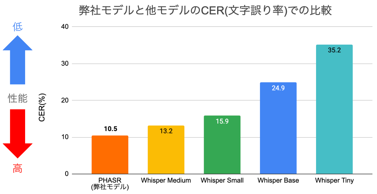 製薬ドメインにおいて、本モデルとCPUで動く一般的な音声認識モデル(Whisper medium、small、base、tiny)との比較実験を行いました。