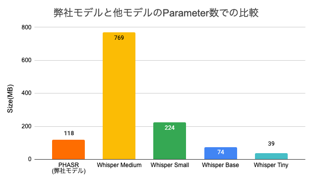 比較の結果、製薬ドメインにおいて、我々のモデルは他のWhisperモデルと比較しても優れた性能を示しました。特に、我々のモデルはサイズがわずか118MBという小規模ながら高品質なモデルであり、これはモデルの効率性と実用性を示す重要なポイントです。