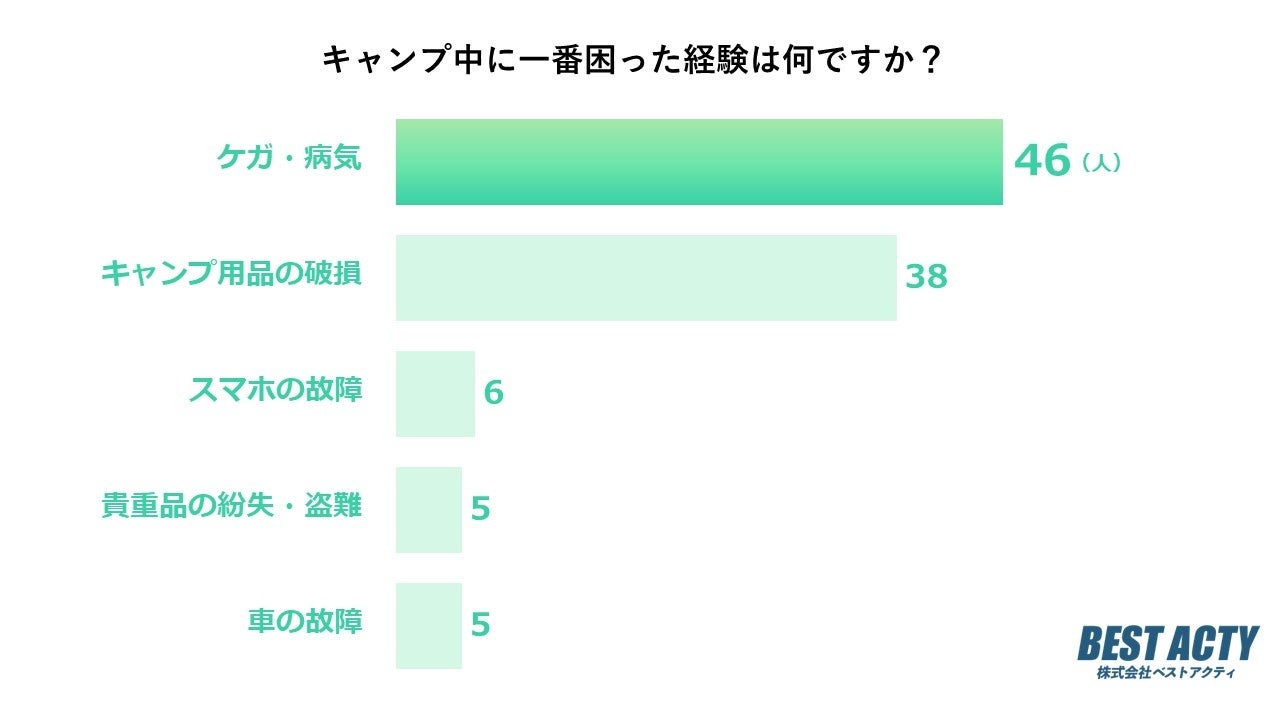 キャンプ中に一番困った経験について100名にアンケートを行ったところ、「ケガ・病気」と回答する人が最も多い結果となりました。