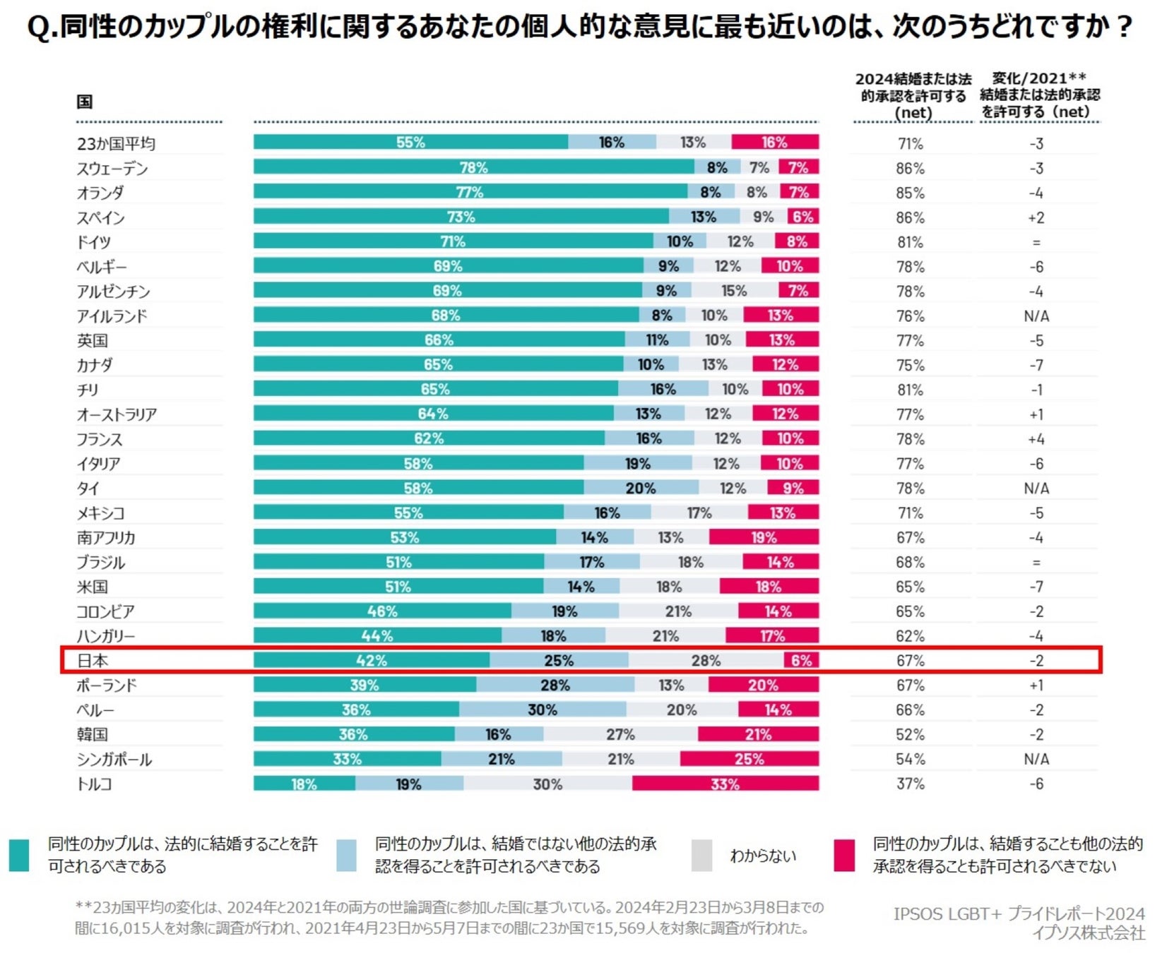同性カップルの結婚および他の法的承認「許可されるべきではない」支持する人の割合、日本が最も少なく6%