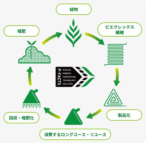 「P-FACTS」(PIECLEX FAbrics Composting Technology Solution)は、ピエクレックス社が主導する循環インフラです。植物由来のポリ乳酸を原料とした「電気の繊維」ピエクレックスを使用したアパレル製品や繊維製品を回収し、林業や農業に活用できる堆肥化と活用まで行います。この取り組みは、パートナー企業や自治体、福祉施設、学校法人など多くのステークホルダーと連携・共創して構築した、透明性の高いプロセスが特徴です。