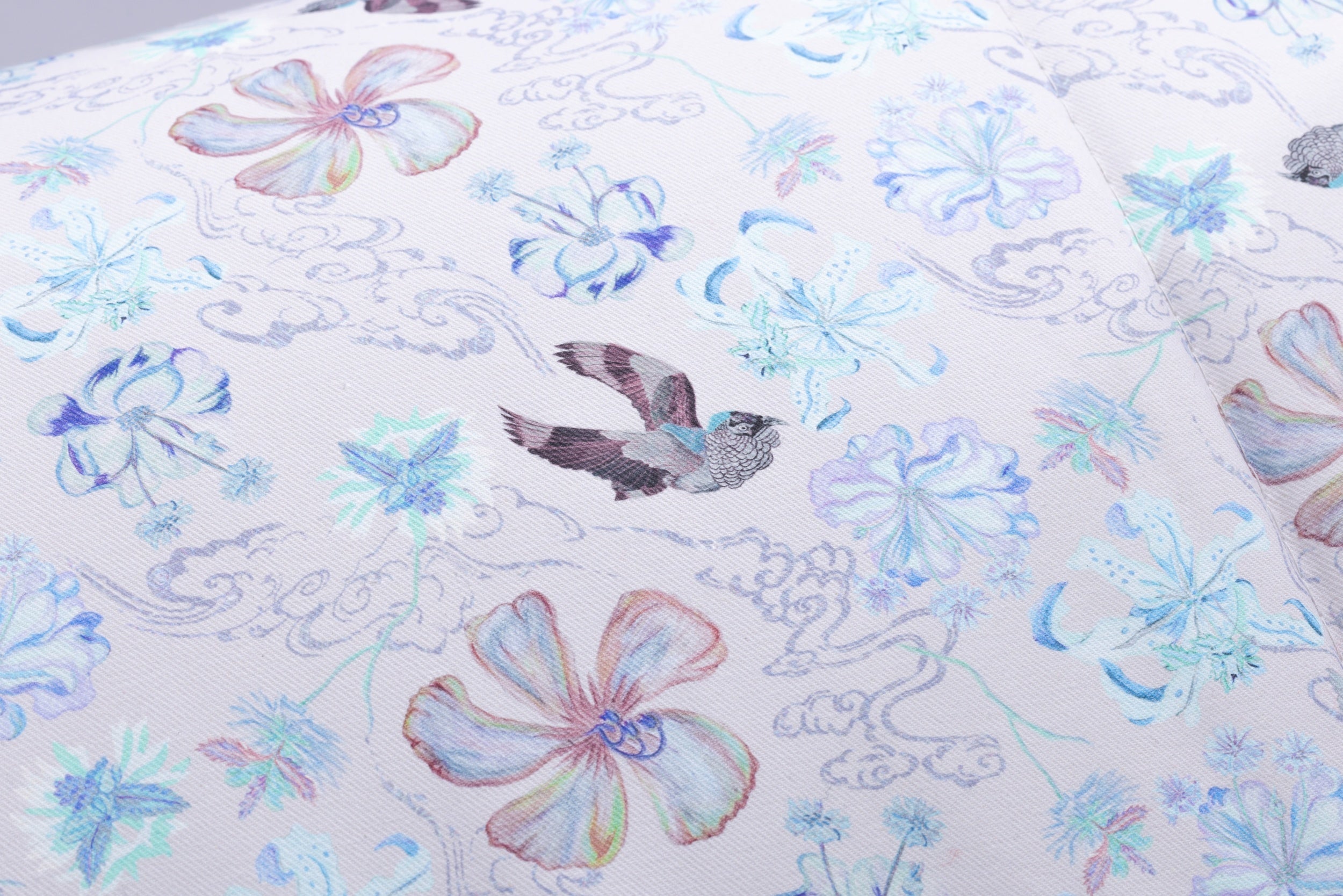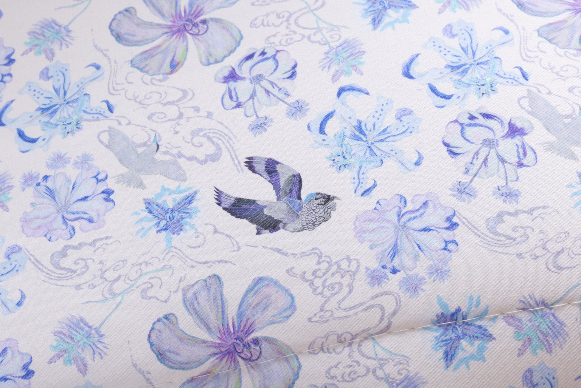 「KAKEHASHI」の生地デザインは、テキスタイルデザイナーの西山景子氏によって、ドリームベッド社がある広島と、ロゼ社があるフランス・ブリオードとを結ぶ懸け橋をイメージして制作されました。水の都と呼ばれる広島には太田川が、ブリオードにはローヌ川が流れ、両都市はいずれも豊かな川の流れを通じて海へとつながっています。その大自然の中で渡り鳥が舞い、日本を象徴する「ツバキ」、原爆に耐え抜いた強く美しい「キョウチクトウ」の花々、フランスの国花である「矢車菊」が生き生きと靡いている様子が生地に描かれています。自然を尊び、人の手で甦った庭園がこのデザインのコンセプトです。カラーはBeigeとPinkの2色から選べます。