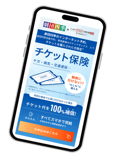 2025年11月18日付ニッセイプラスNews Releaseのとおり、ニッセイプラスは、日本を代表する舞台演劇の担い手である、劇団四季、松竹株式会社の両社から、お客様の観劇スタイル、公演チケットの販売の仕組みや特徴などについて助言を受け、キャンセル費用補償保険の商品開発に取り組んでまいりました。今般、本日1月28日より、劇団四季の直接販売チケットを対象とする「チケット保険」の販売を開始しました。