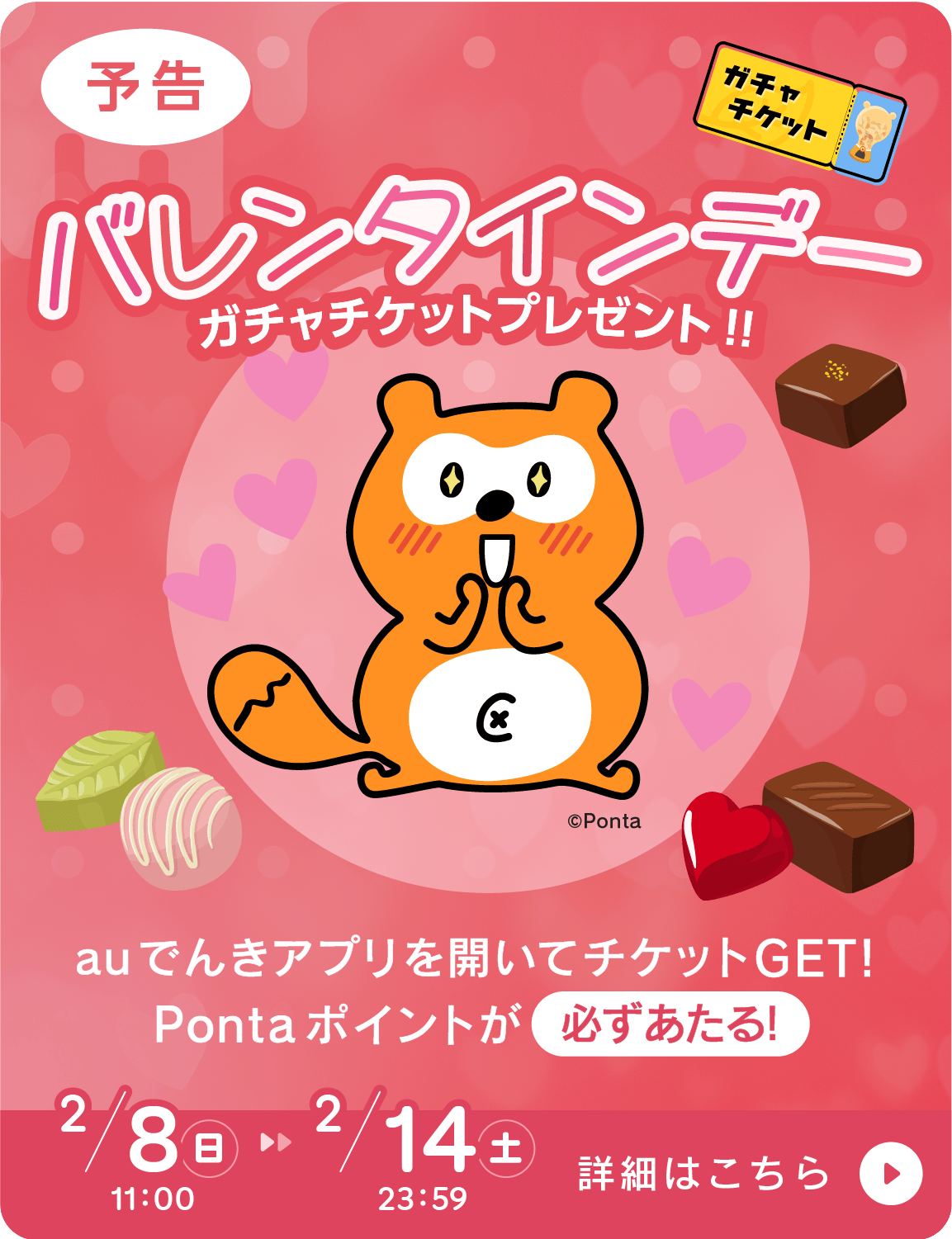 auエネルギー&ライフ株式会社(本社:東京都千代田区、代表取締役社長:齋藤 茂、以下 auエネルギー&ライフ)は、auでんきアプリをご利用のお客さまを対象に、最大1,000 Pontaポイントが当たる“バレンタインデー限定ガチャ”を実施します。期間中にアプリを起動するだけでガチャチケットを1枚受け取ることができ、どなたでも1回ガチャをお楽しみいただけます。
