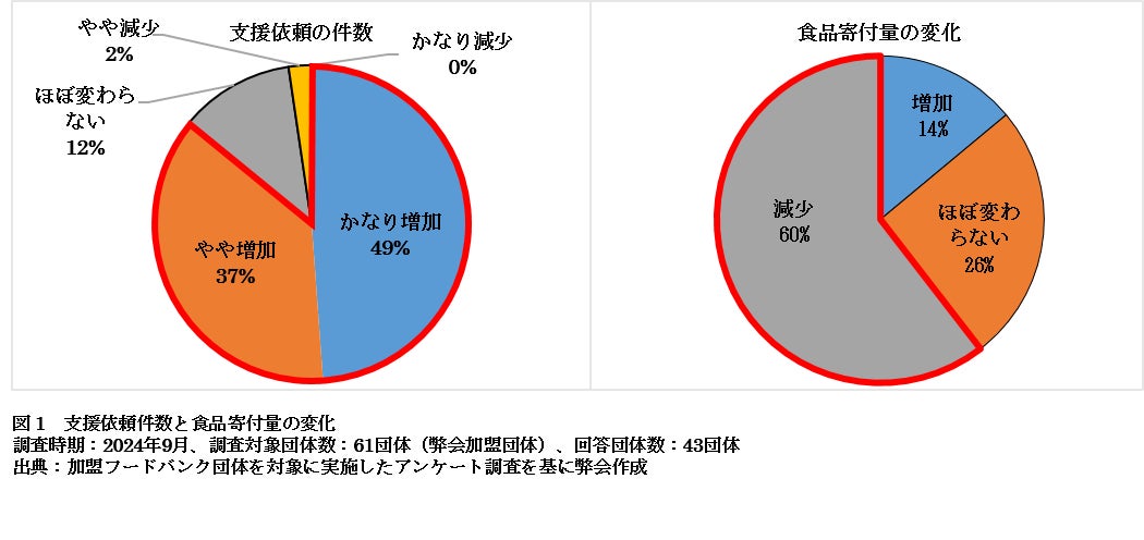 一方で、フードバンク団体による食料支援は、地域のすべてのニーズを十分にカバーできていないのが現状です。弊会の加盟フードバンク団体を対象に昨年実施したアンケート調査では、8割以上の団体で困窮世帯からの食料支援要請が増加している一方で、6割のフードバンク団体では食品の寄付が減少していることが明らかになりました(図 1)。
