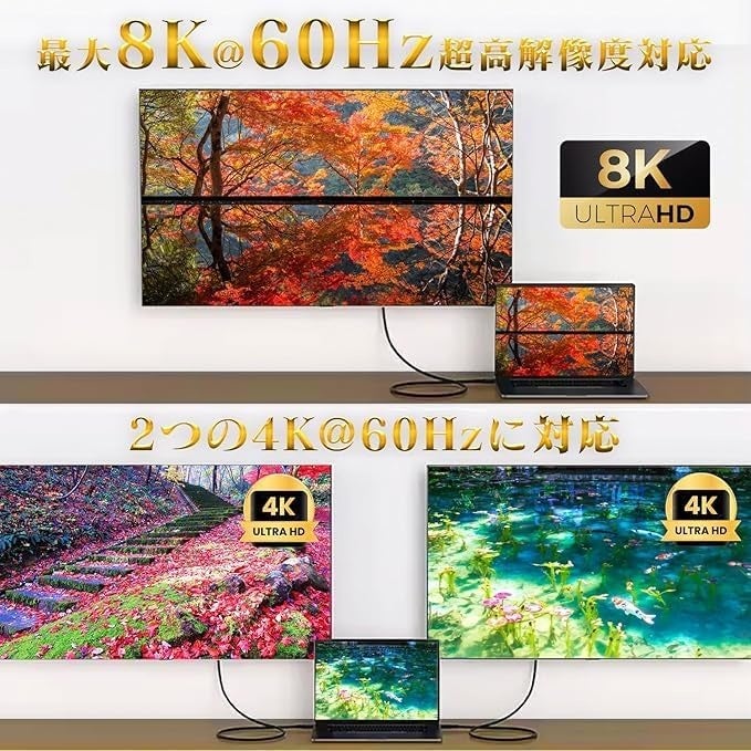 最大8K@60Hz UHD解像度に対応 / 8Kディスプレイ1台または4Kディスプレイ2台を駆動可能