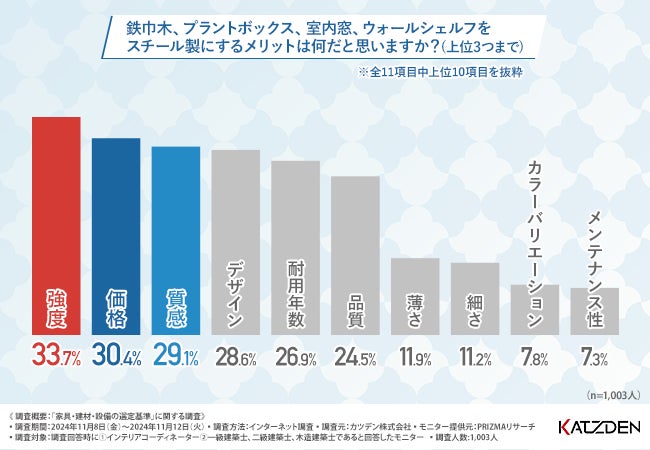 最後に「金属巾木、プラントボックス、室内窓、ウォールシェルフをスチール製にするメリットは何だと思いますか?(上位3つまで)」と質問したところ、『強度(33.7%)』『価格(30.4%)』『質感(29.1%)』となりました。