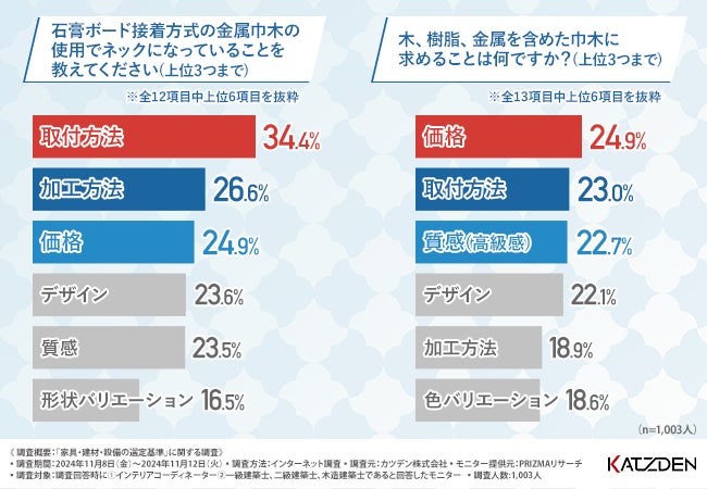 金属巾木については、石膏ボード接着方式の金属巾木の施工に共通の難しさを感じており、両職種とも「取付方法」に課題を感じている点でも、選ぶ際の基準となっているようです。