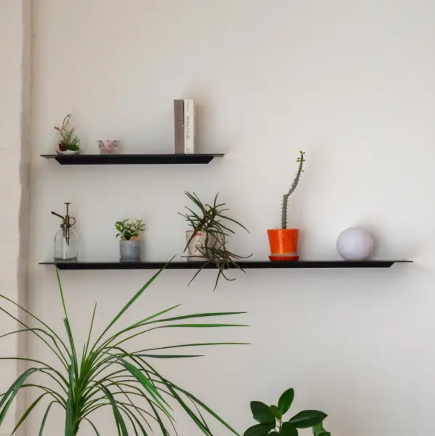 耐荷重は5〜20kgと、上に置けるものは限られるものの、ミニマルで薄いデザインに仕上げました。飾り棚として、上に置かれたものを引き立てる存在に。