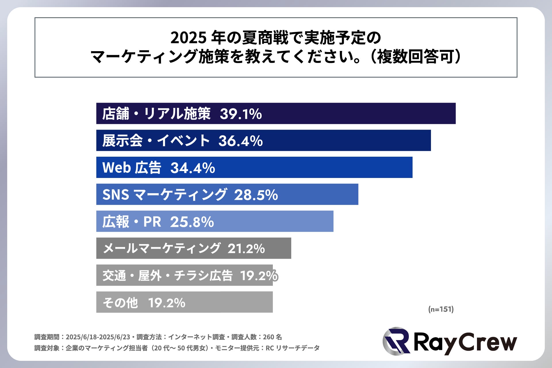 2025年の夏商戦に向けてマーケティング活動を予定している企業が実施予定の施策トップ3は、1位「店舗・リアル施策」、2位「展示会・イベント」、3位「Web広告」