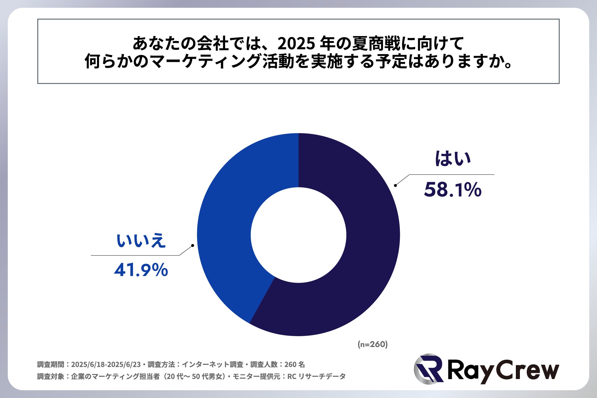 まず、「2025年の夏商戦に向けて何らかのマーケティング活動を実施する予定はあるか」を尋ねる設問への回答では、「はい」が58.1%で、「いいえ」が41.9%という結果になりました。この結果から、企業のマーケティング担当者の6割弱が、2025年の夏商戦に向けた何らかのマーケティング活動を予定していることが明らかになりました。