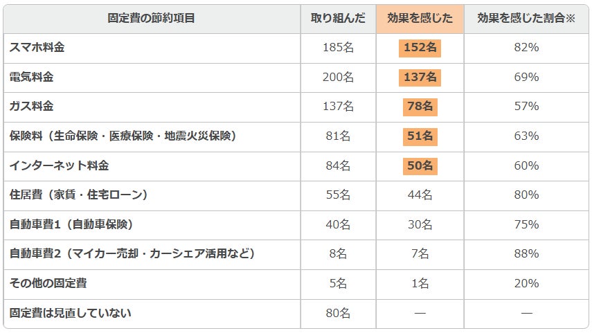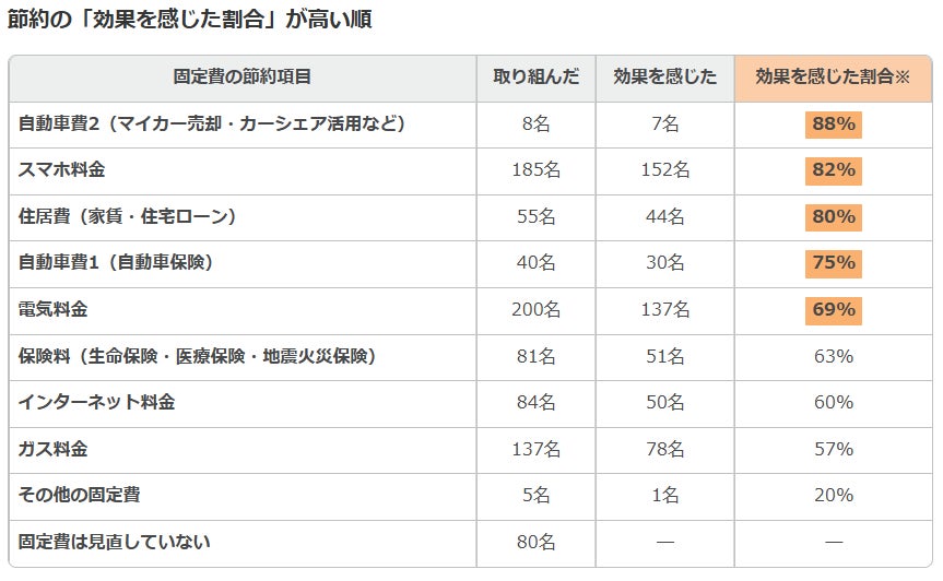 固定費の節約は、自動車費や住居費など「取り組む人は少ないが、実は節約効果の高い項目」が「効果を感じた割合が高いもの」として上位にあがっています。