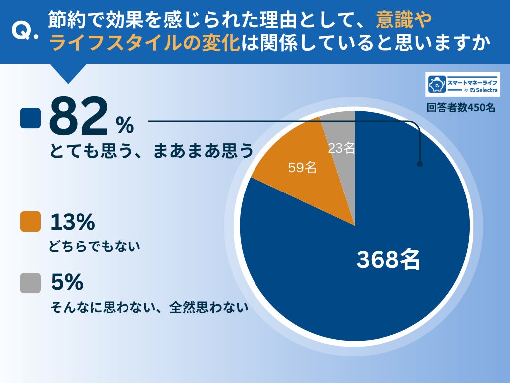 セレクトラ・ジャパン株式会社(東京都渋谷区、代表取締役:グザビエ・ピノン)が運営する、お金の情報メディア「スマートマネーライフ(https://smart-moneylife.jp)」では、「この1年以内に節約に取り組み、効果を実感した450名」を対象に、独自アンケートを実施しました。