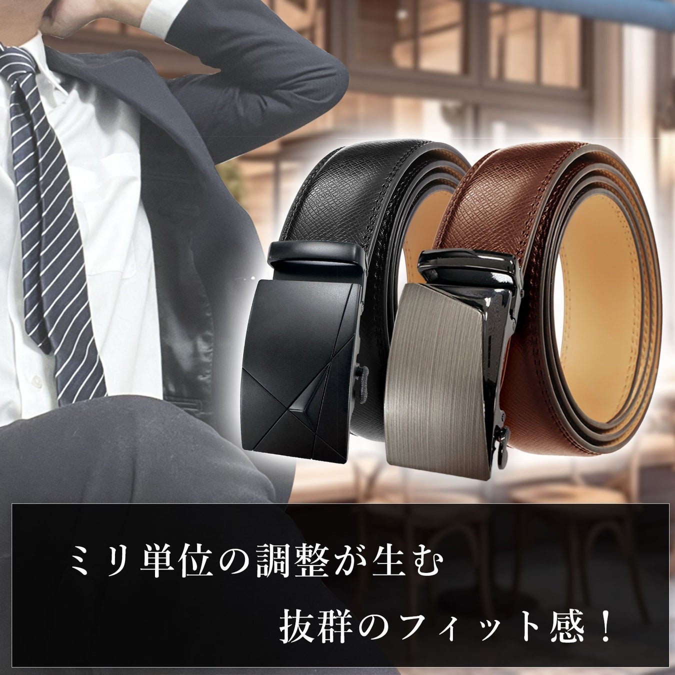 スーツのようなカッチリしたビジネススタイルはもちろん、ジーンズなどのカジュアルスタイルにも対応できるビジネスカジュアルベルトです。