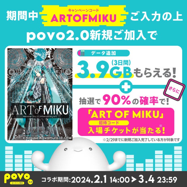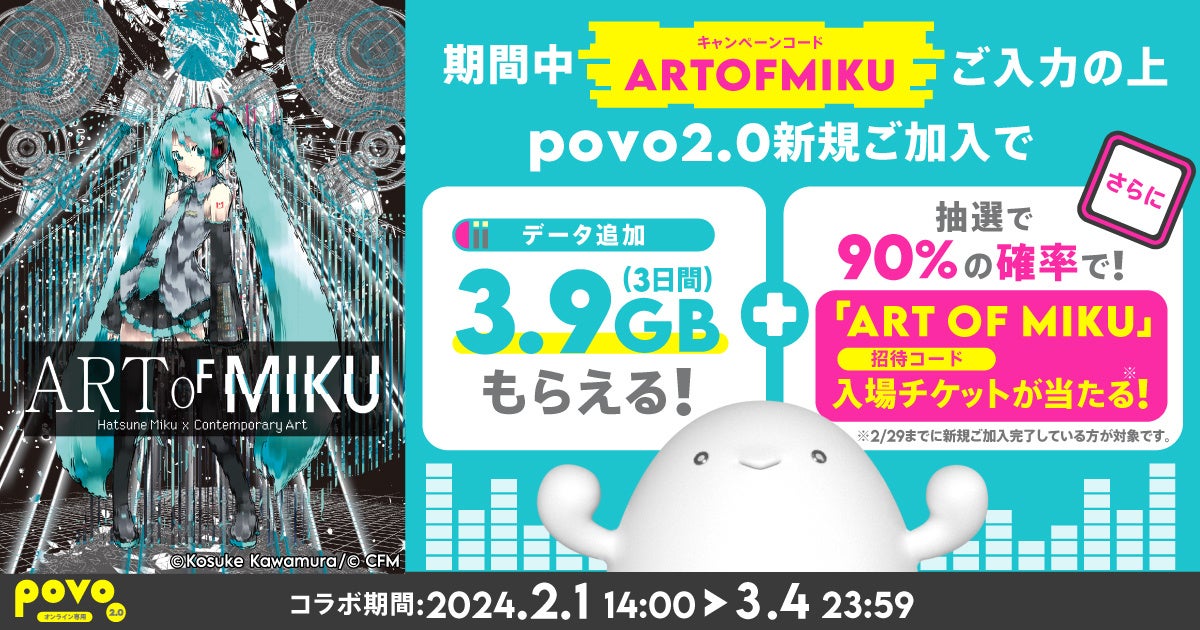 2月1日(木)より、クリエイターの活動を支援するpovoの新たな取り組みとして、国内初の初音ミクの現代アート展「ART OF MIKU」とのコラボキャンペーンを開始。豪華特典の提供により、バーチャル・シンガーの初音ミクと、初音ミクをリスペクトするアーティスト、両者のファンの活動を応援します。本キャンペーンはライバーに限らず、対象のキャンペーンコードを入力して「povo2.0」を新規加入いただいた方・他社からのお乗り換えをいただいた全員が参加可能です。
