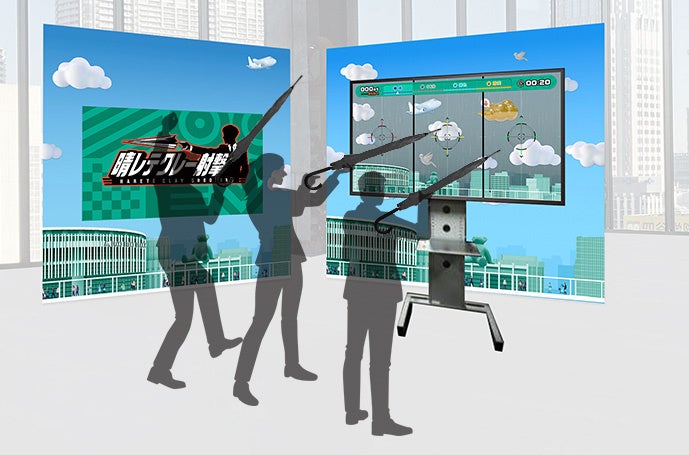 昨年も好評だった「晴レテクレー射撃」が、今年は冬季バージョンにアップデート。クレー射撃競技をモチーフに、画面に現れる雪雲や金色の雲、UFOを傘型のデバイスで狙う競技です。参加者となる店舗スタッフ等にとって、雪や雨ではなく、より集客・売上の見込める晴れの日を願う思いから着想を得ました。