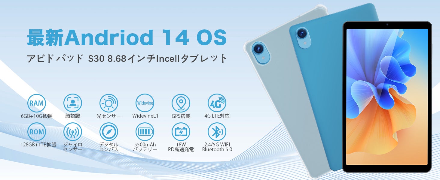 【Android 14 タブレット 8.68インチIncell】アビドパッド S30 simフリー タブレット RAM16GB(6+10拡張) ROM128GB 8コアCPU WIFI/SIM通話モデル ジャイロセンサー デジタルコンパス 光センサー 大容量バッテリー 顔認識 Widevine L1対応 GPS/GMS/TELEC認証済 325g超軽量 日本語仕様書
