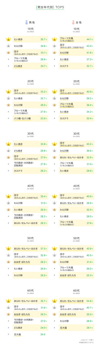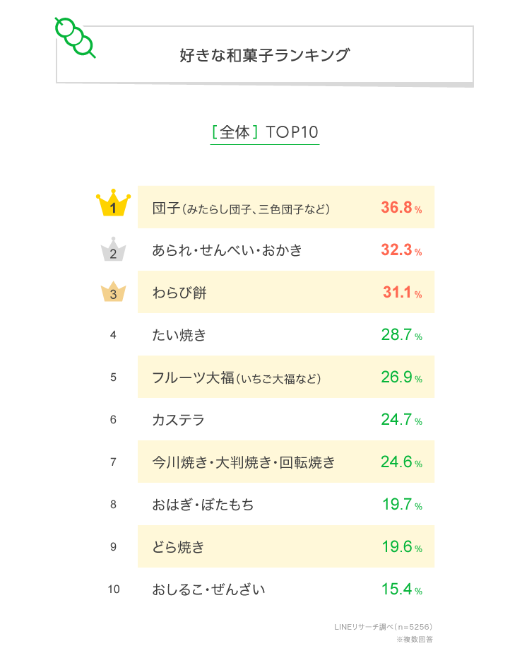 このたびLINEリサーチでは、日本全国の男女を対象に、好きな和菓子について調査しましたので、その結果をお知らせいたします。