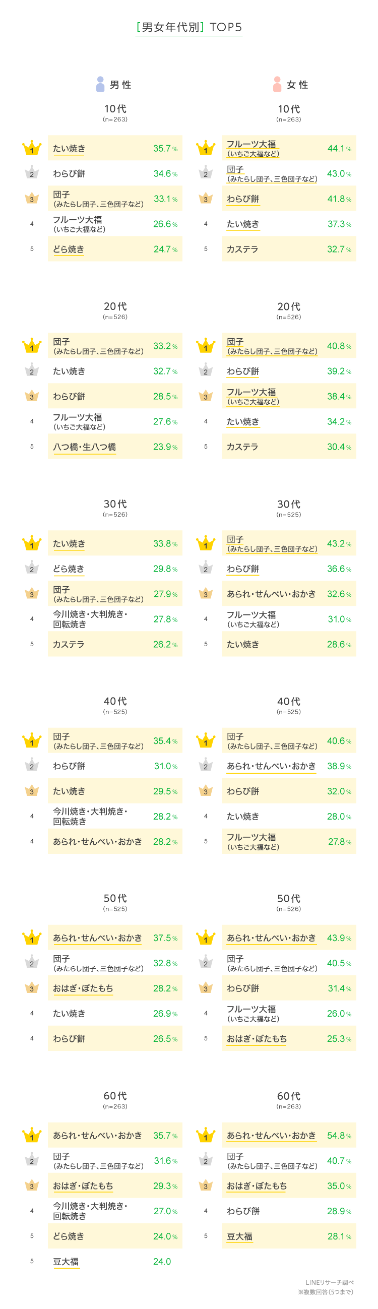 男女年代別にみると、全体1位の「団子」はすべての年代でも3位以内にランクインしました。男性よりも女性のほうが高い割合で、女性のすべての年代で4割を超え高くなっていました。