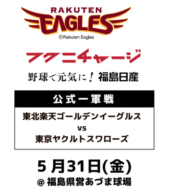 福島日産自動車株式会社(以下福島日産と略、本社:福島県福島市、代表:金子 與志幸)は、2024年5月31日(金)に福島県営あづま球場で開催される 「福島日産 野球で元気に!フクニチャージ ナイター 日本生命セ・パ交流戦2024 東北楽天ゴールデンイーグルス(以下楽天イーグルス) vs. 東京ヤクルトスワローズ(以下東京ヤクルト)」への冠協賛を行います。