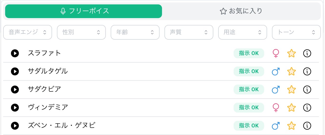 「性別(男性・女性・不明)」や「年齢(子供・若年・成人・高齢)」を選択することで、動画のターゲットペルソナに合致した候補を即座に抽出。視聴者層に馴染む音声を選定することで、離脱を防ぎ、視聴維持率の向上に貢献します。