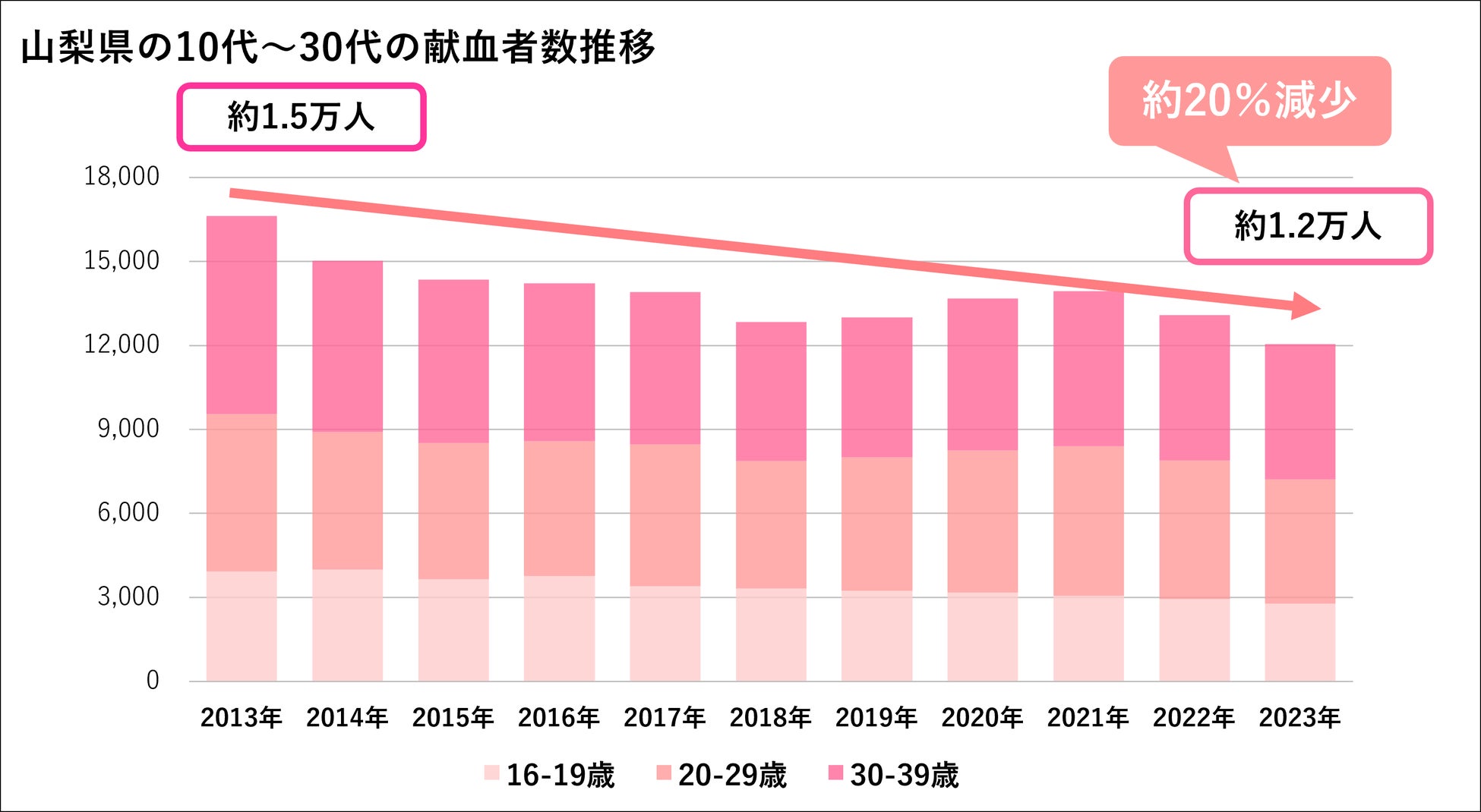 山梨県においては、高等学校での献血実施を積極的に行ってきましたが、約20%の減少が起こっています。