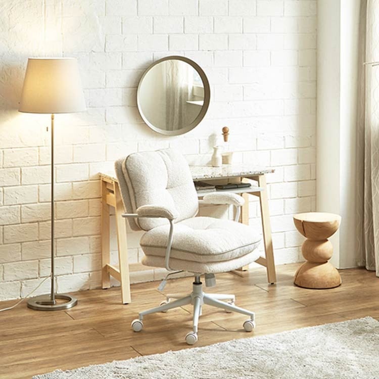 ふかふかクッションが魅力のオフィスチェア。座るたびにじんわりと温もりを感じるファブリック素材で、在宅ワークや読書タイムにも最適。冷えが気になる冬のデスクワークを快適にします。
