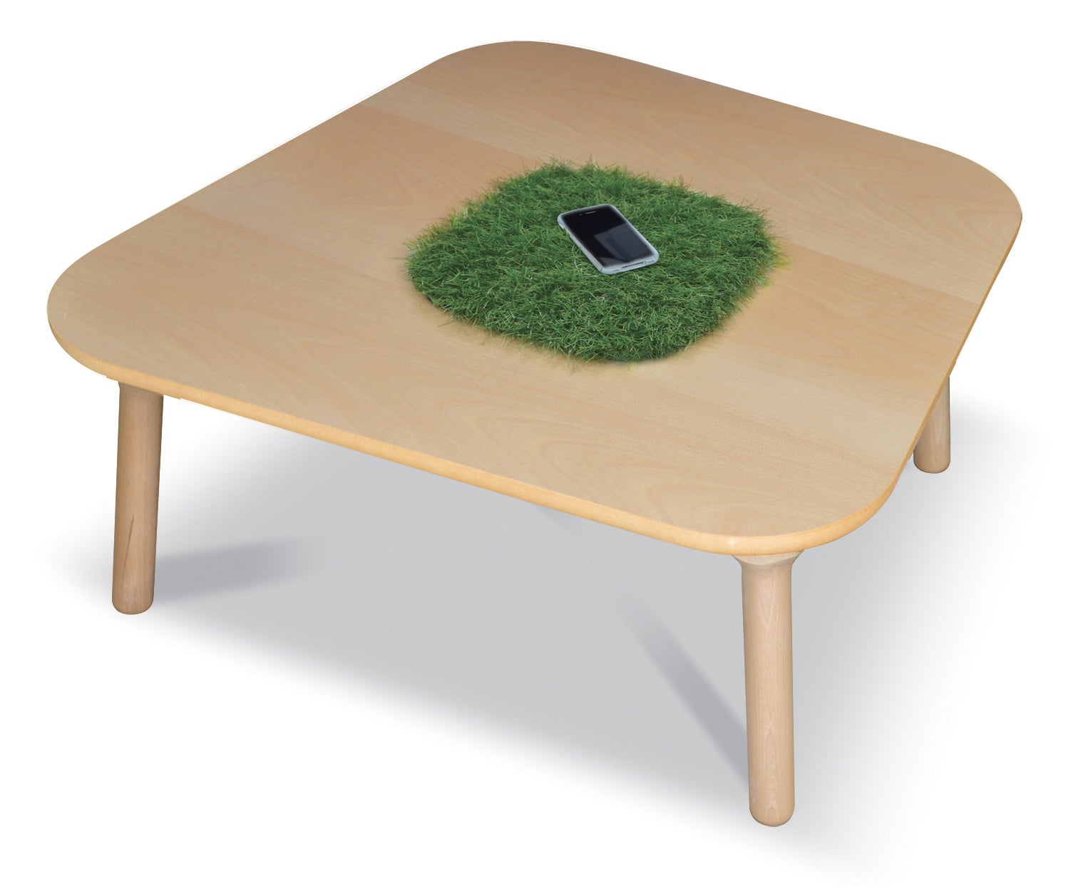 天板中央に人工芝をあしらったユニークなデザインのこたつテーブル。柔らかなナチュラルカラーの木目と、“自然のぬくもり”を感じる遊び心あるデザインが人気です。