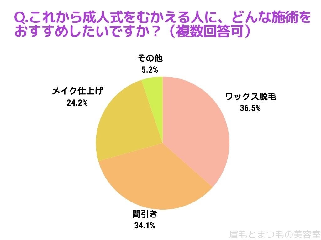 これから成人式をむかえる人に、眉毛サロンでおすすめの施術をお聞きしたところ「ワックス脱毛(36.5%・92票)」、「手入れをしなくてもキレイ(34.1%・86票)」、「メイクの時短になる(24.2%・61票)」、「その他(5.2%・13票)」という結果になりました。