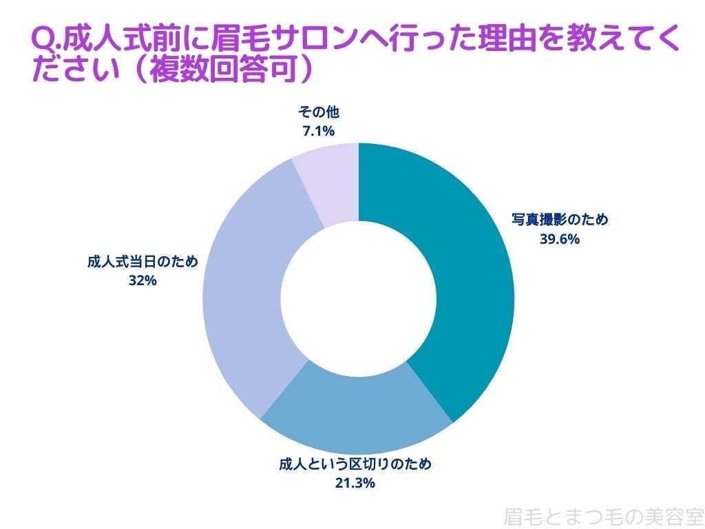 一生記念として残る写真撮影のためと答える人が多かったです。また、成人式当日に正装に負けないような眉にしたいという意見もありました。成人として美容に気をつかう姿勢を見せる人もおり、成人式はそのタイミングとしてちょうど良いということが分かります。
