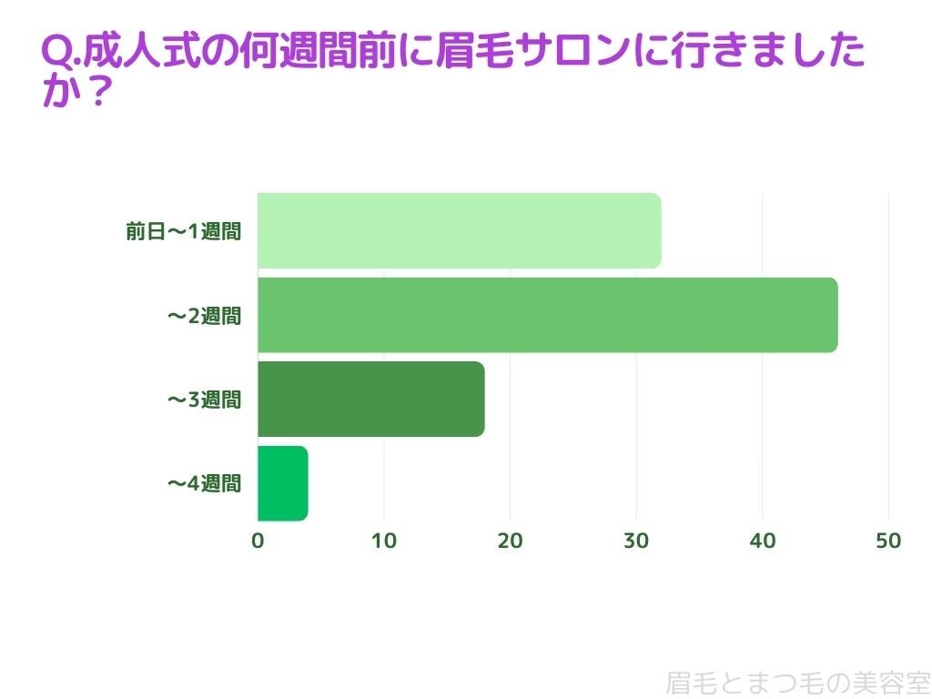 成人式の1〜2週間前に行く人が、過半数を超えているということが分かります。眉毛サロンの持続効果のことを考えると2週間前くらいが良いのかもしれません。3週間より前に行った人の中には、効果が薄れてきたという声もありました。
