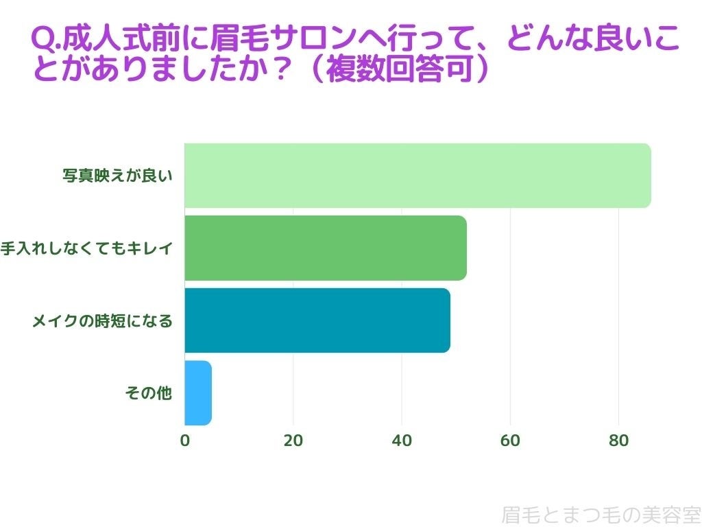 成人式前に眉毛サロンに行った人のなかで多かったのが、写真映えが良くなるという声。眉毛サロンで眉を整えることで、あか抜けた雰囲気で写真を残せるのが人気のようです。多くの人と写真を撮る機会がある成人式は、眉毛サロンに行く大チャンスと言えるでしょう。