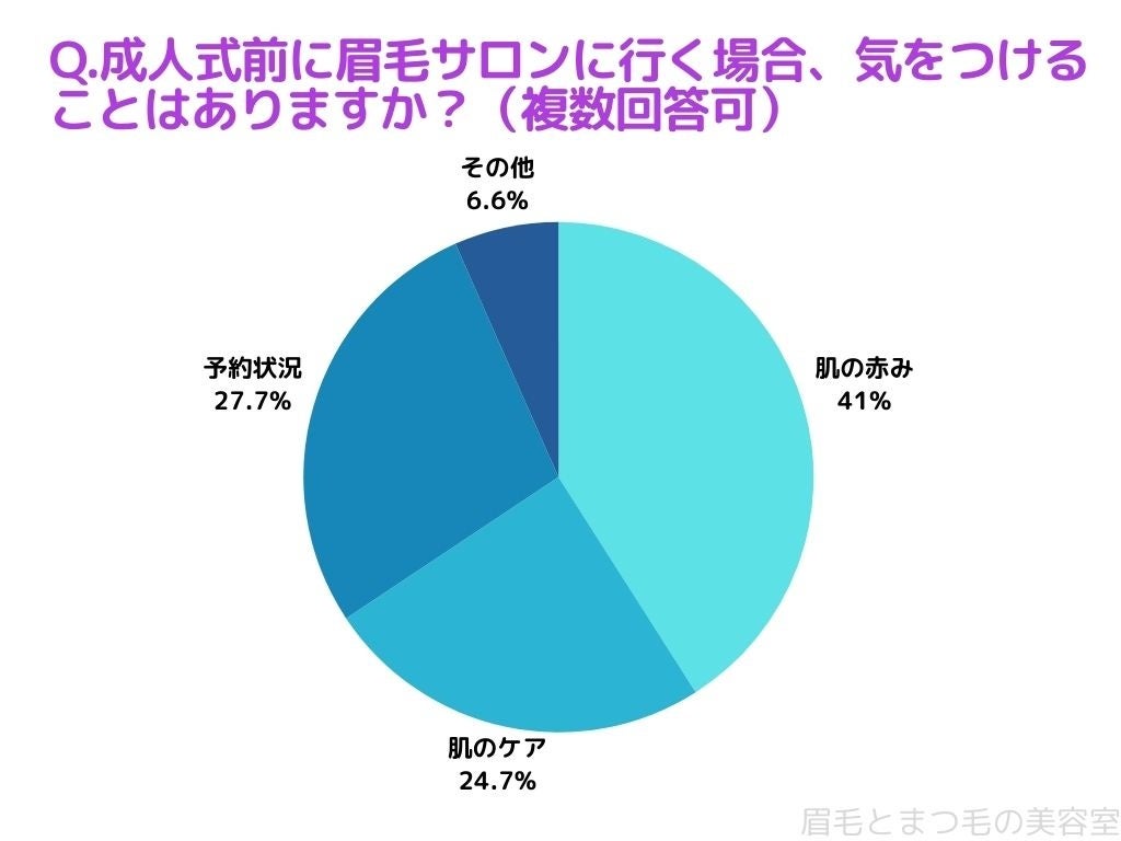 成人式前に眉毛サロンに行く場合、気をつけることはあるかをお聞きしたところ「肌の赤み(41%・68票)」、「肌のケア(24.7%・41票)」、「予約状況(27.7%・46票)」、「その他(6.6%・11票)」という結果になりました。