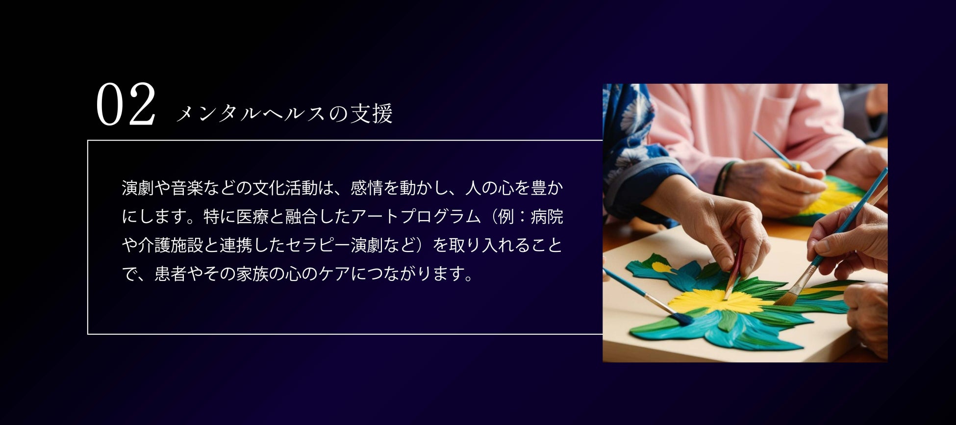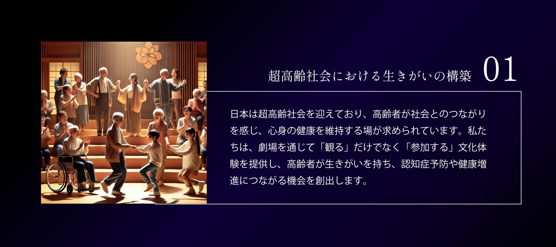 他にも、ストレス・孤独感軽減や認知機能向上といった力を持ち、身体的・精神的・社会的にさまざまな「健康」を創っている「文化」。このように、文化は単なる「生きるための手段」ではなく、私たちにとって欠かせない豊かな生活を作り上げるための礎であり、心と体の健康を支える力強い源であるといえます。私たちはこの「文化」を守り、次世代へと継承し、さらなる発展を遂げていくべく“生きるを満たす”劇場創生の幕をあげました。