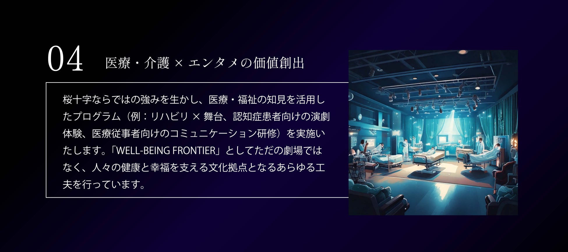 医療・介護・予防医療を軸にウェルビーイング・フロンティアを目指す桜十字グループは、ウェルビーイングと文化の深い関わりに着目し、人々の“生きるを満たす”劇場「 WELL-BEING THEATER 」をオープンいたします。