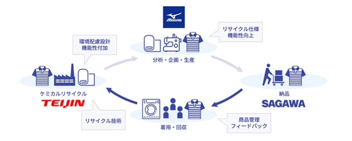 佐川急便株式会社(本社:京都市南区、代表取締役社長 笹森 公彰、以下「佐川急便」)と、ミズノ株式会社(本社:大阪市住之江区、代表取締役社長 水野 明人、以下「ミズノ」)および、帝人フロンティア株式会社(本社:大阪市北区、代表取締役社長執行役員 平田 恭成、以下「帝人フロンティア」)は、サステナブルな社会の実現に向け、佐川急便の使用済みユニフォームを新たなユニフォームへと循環させる「資源循環スキーム」(以下:本スキーム)のトライアル運用を開始しました。この取り組みは、佐川急便の「環境理念・環境方針」に基づく3R(リデュース・リユース・リサイクル)活動の長年の取り組みと、ミズノが有する製品設計や広域認定事業者※1としてのノウハウ、および帝人フロンティアが長年培ってきたポリエステルリサイクルや素材開発の技術力、資源循環の取り組みの知見を活用し、後の本格展開に向けた実証段階として位置づけています。