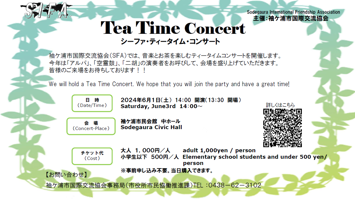袖ケ浦市国際交流協会が主催するイベント「ティータイムコンサート」を2024年6月1日(土)に市民会館中ホールで開催します!