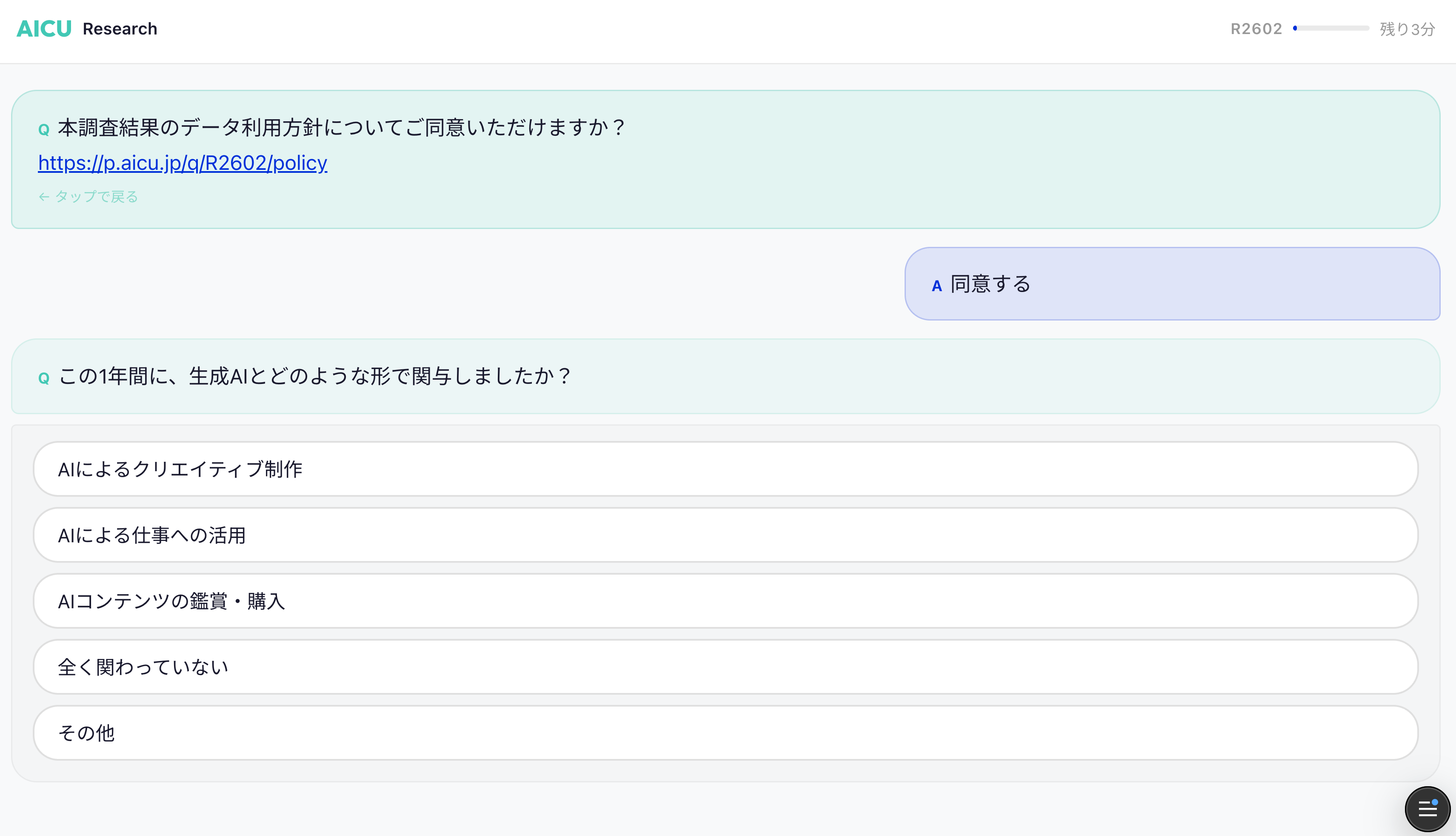 生成AI時代の"つくる人"調査(R2602)を開始しました。 チャットで答える新感覚アンケート! 約3分で完了&10,000ポイントもらえます。 https://p.aicu.jp/R2602 #AICU #生成AIつくる人調査